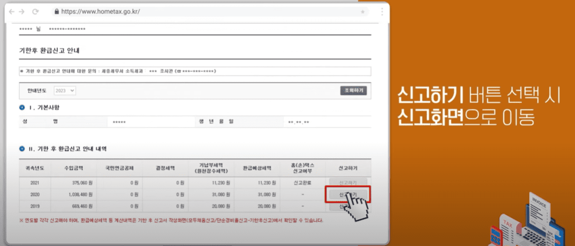 - 손택스 : 자주찾는 메뉴 > 종합소득세 기한 후신고 > 종합소득세 환급금 조회