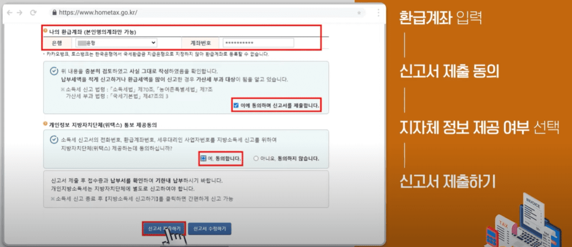 6. 환급받을 계좌와, 신고서 제출 동의 등을 선택후 최종 제출하기 버튼으로 완료합니다.