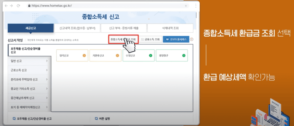 - 홈택스 : 홈택스 > 종합소득세 신고 > 모두채움/단순경비율 신고 > 종합소득세 환급금 조회