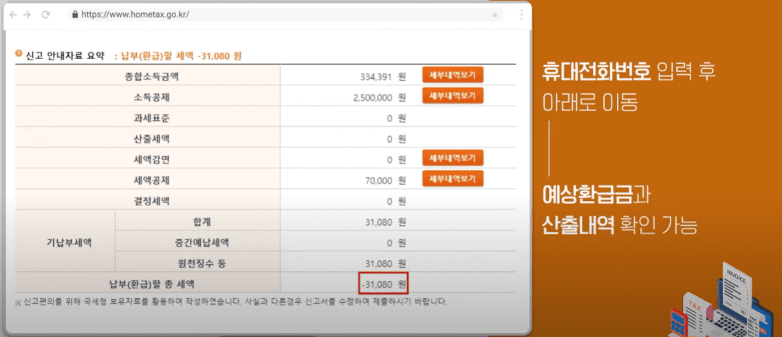 5. 휴대전화번호 입력 후 스크롤을 내려 예상 환급금과 산출내역을 확인합니다.