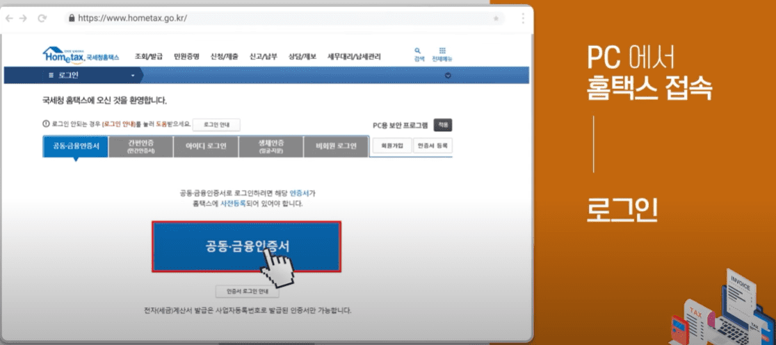 1. 홈택스에 접속한 다음 인증서를 통해 로그인합니다.