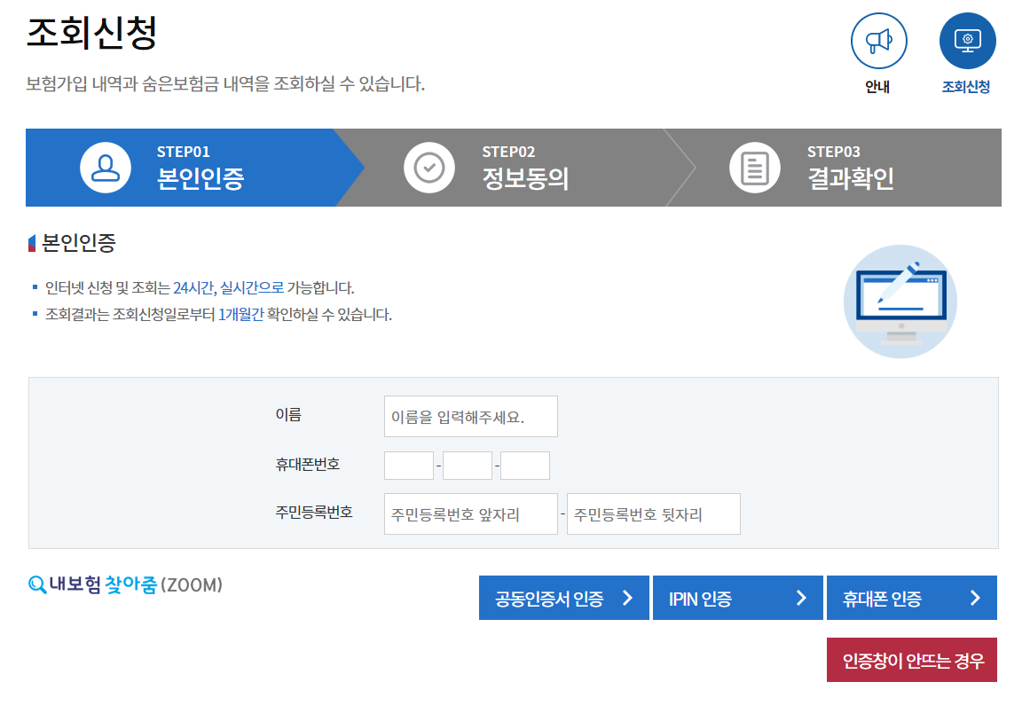 1. 이름, 휴대폰번호, 주민등록번호를 입력 후 [공동인증서] or [IPIN 인증] or [휴대폰 인증] 인증하기