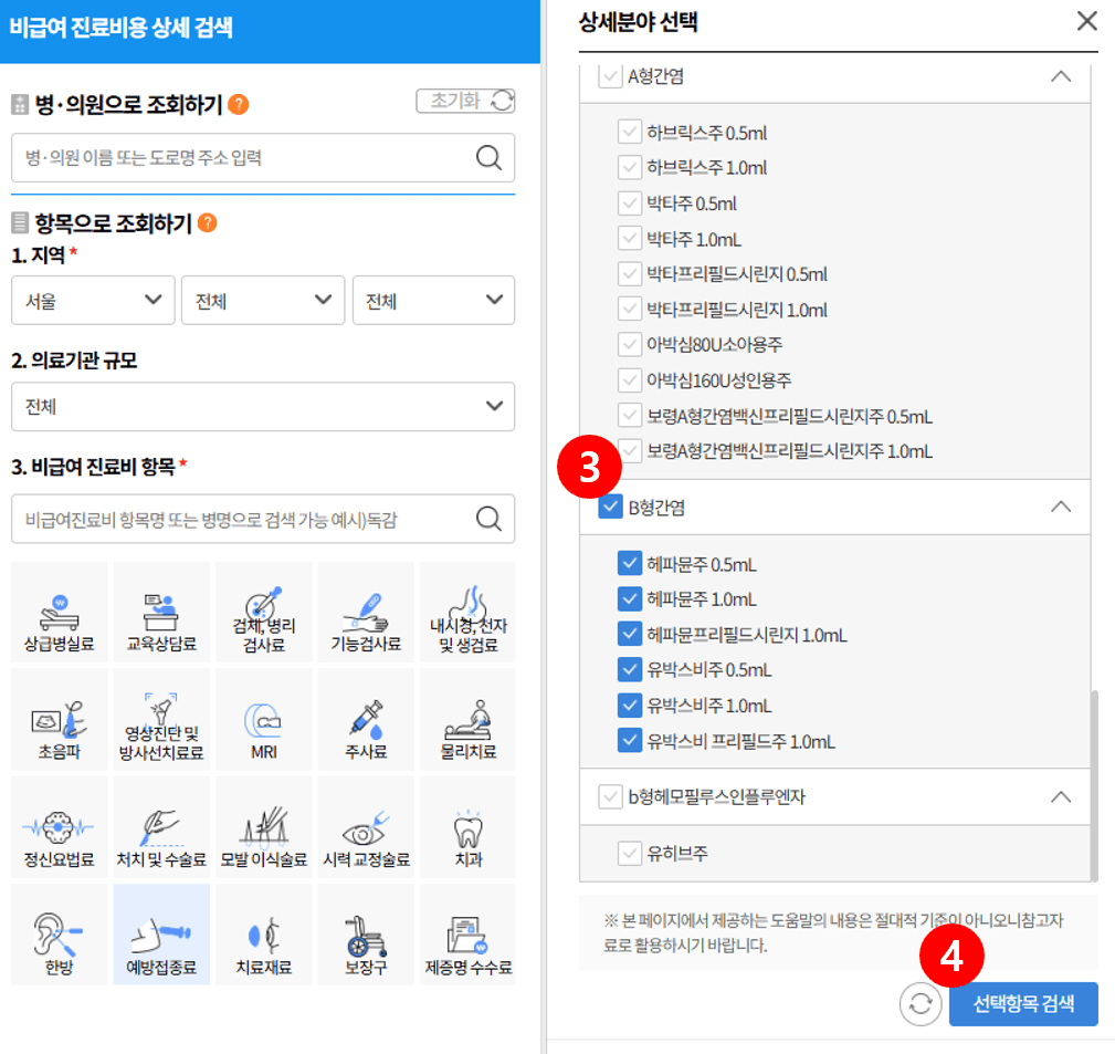 4. B형 간염 항목을 선택한 후 [선택항목 검색] 버튼을 클릭합니다.